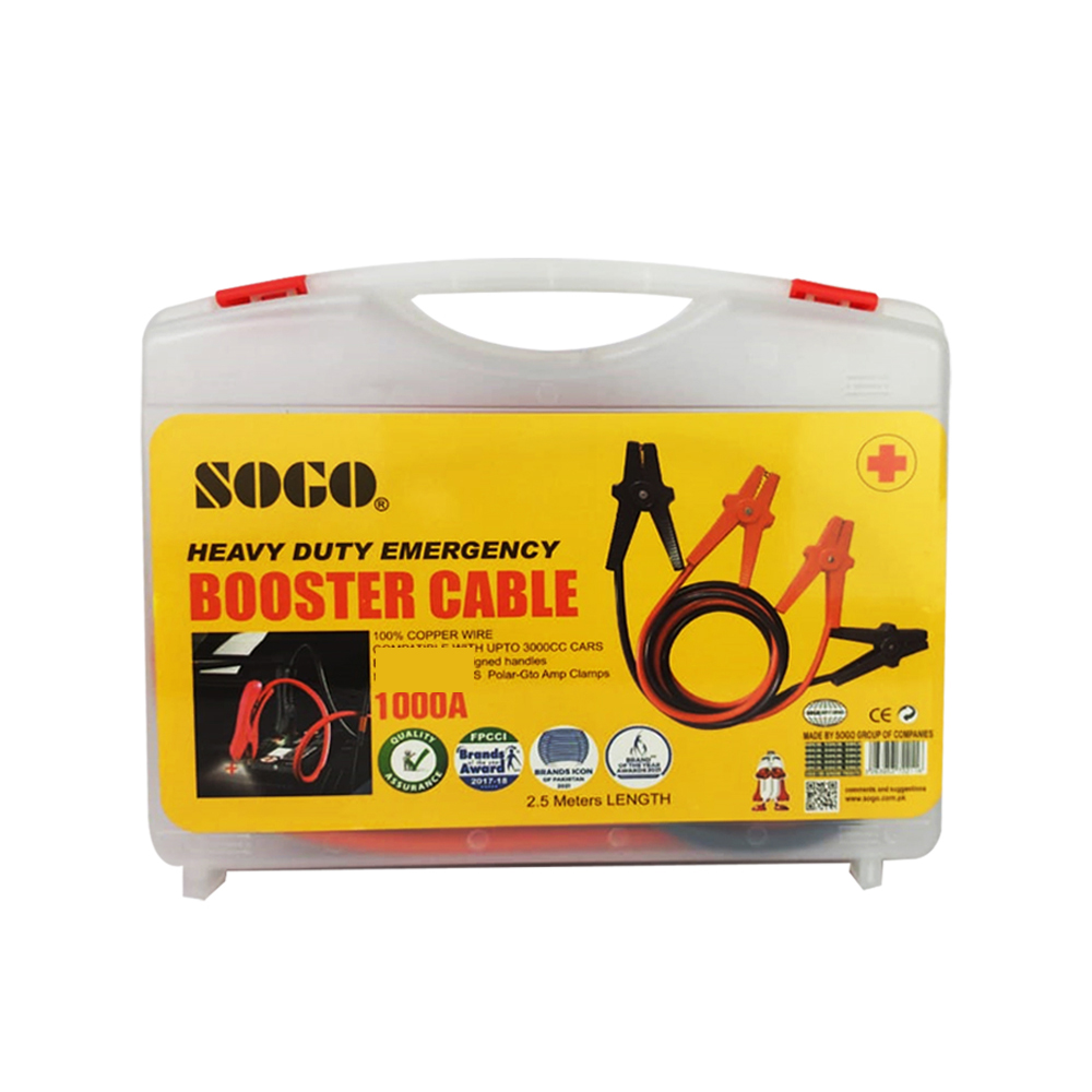 The SOGO 1000 AMP jumper cables are high-quality, durable, heavy-duty jumper cables that have a thick inner core, connect, and start your dead or weak car battery fast. Suitable for cars, coupes, sedans, SUVs, full-size vans, larger trucks, farm equipment, and more. The safety feature of the shelled vinyl-coated clamp for rust and corrosion protection also includes a strong spring and a comfortable, custom-made handle for secure placement. Our SOGO jumper cables come with a high-grade travel bag for easy transport and compact storage.